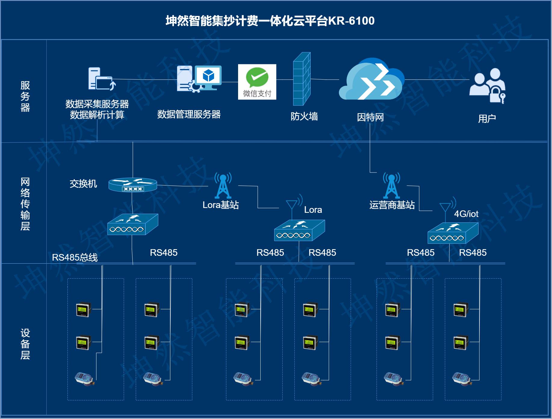 《坤然智能KR-6100集抄計費一體化云平臺》由系統(tǒng)中的各計量裝置、數(shù)據(jù)采集傳輸終端、數(shù)據(jù)中心組成。