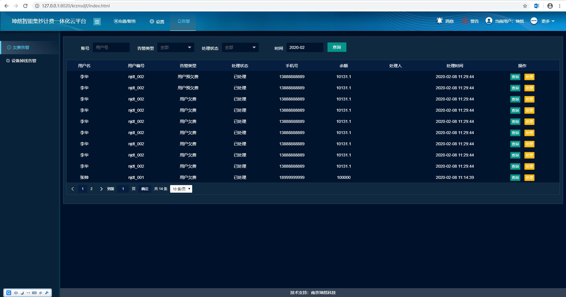 告警查看:系統(tǒng)管理員可查看系統(tǒng)所有用戶欠費告警信息。
